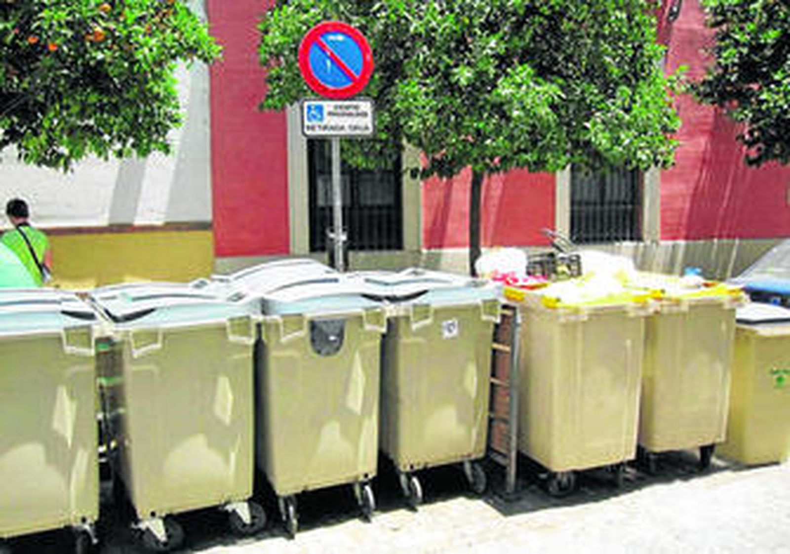 Hasta cuatro contenedores de basura ocupan un espacio de la vía, en la calle San José, destinado a plazas de aparcamiento para personas con discapacidad, indicado, además, por una señal de tráfico ¿También la grúa va a retirar los contenedores o hará la vista gorda?