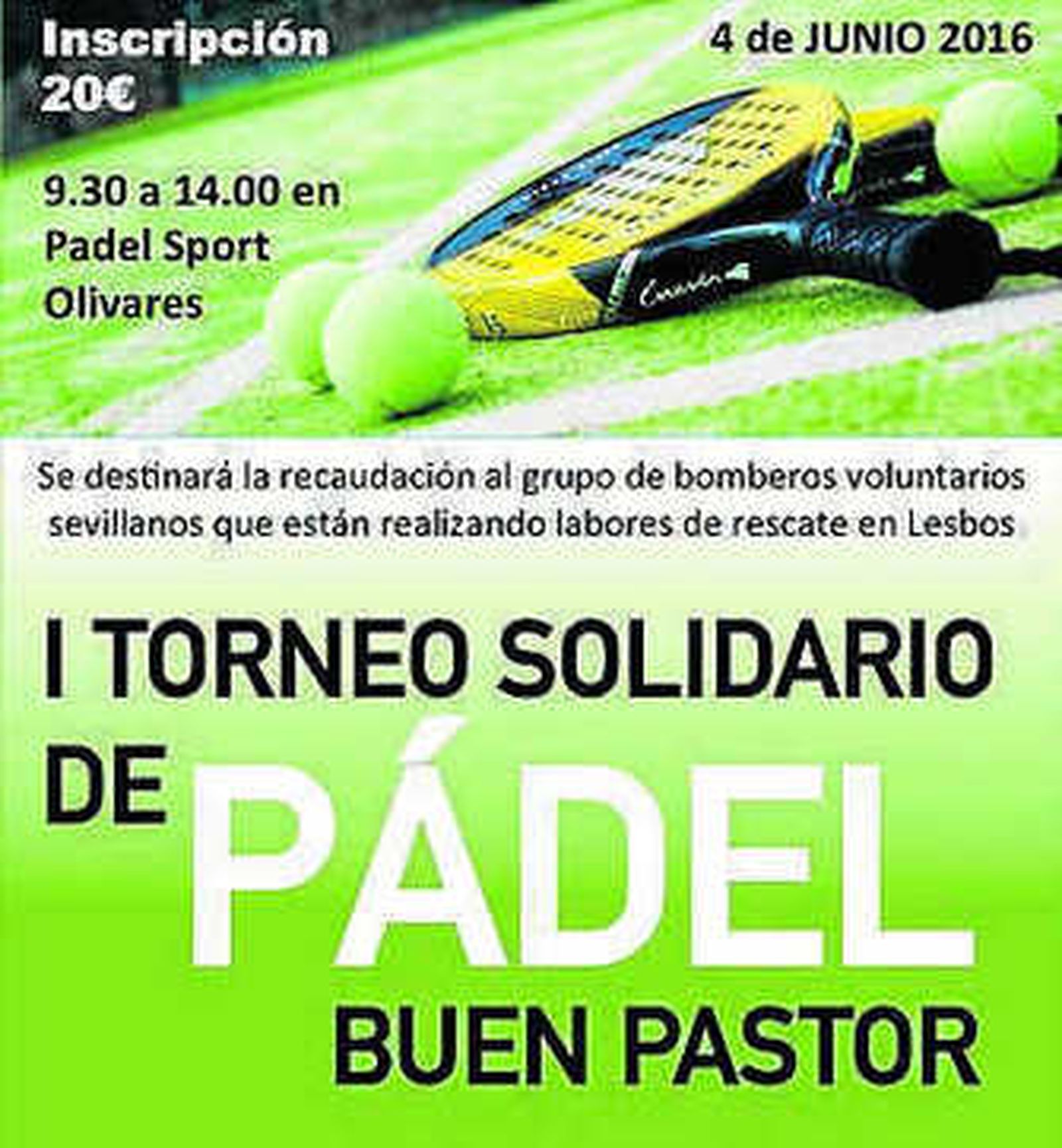 El colegio Buen Pastor de Sevilla organiza hoy, desde las 09:00 en las instalaciones Pádel Sport Olivares, situadas en el número 8 de la Avenida del Palomar, el I Torneo Solidario de Pádel al que acudirán representantes del grupo Proem-Aid, así como el coordinador del mismo y del proyecto que llevan a cabo un grupo de bomberos sevillanos en Lesbos.