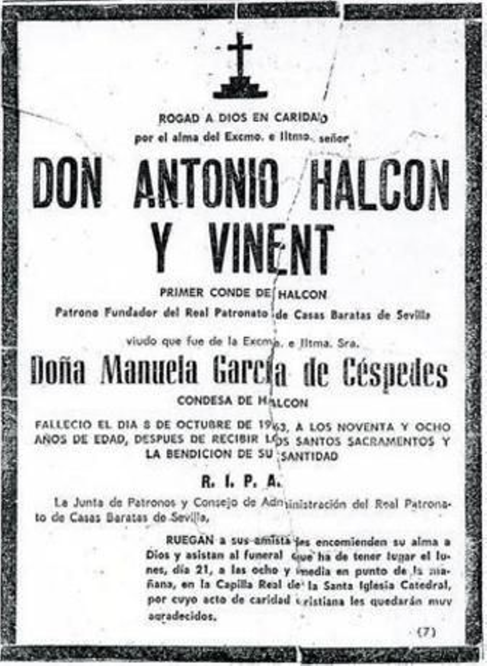 Antonio Halcón y Vinent (Sevilla, 28 de febrero de 1865-8 de octubre de 1963), primer conde de Halcón, tuvo su segundo mandato como alcalde de la ciudad desde abril de 1922 a agosto de 1923. Fue otra etapa de ensanches que marcó un hito histórico con el derribo del edificio del café-cantante Novedades para abrir la actual calle Martín Villa y propiciar un nuevo ensanche de la plaza de la Campana.