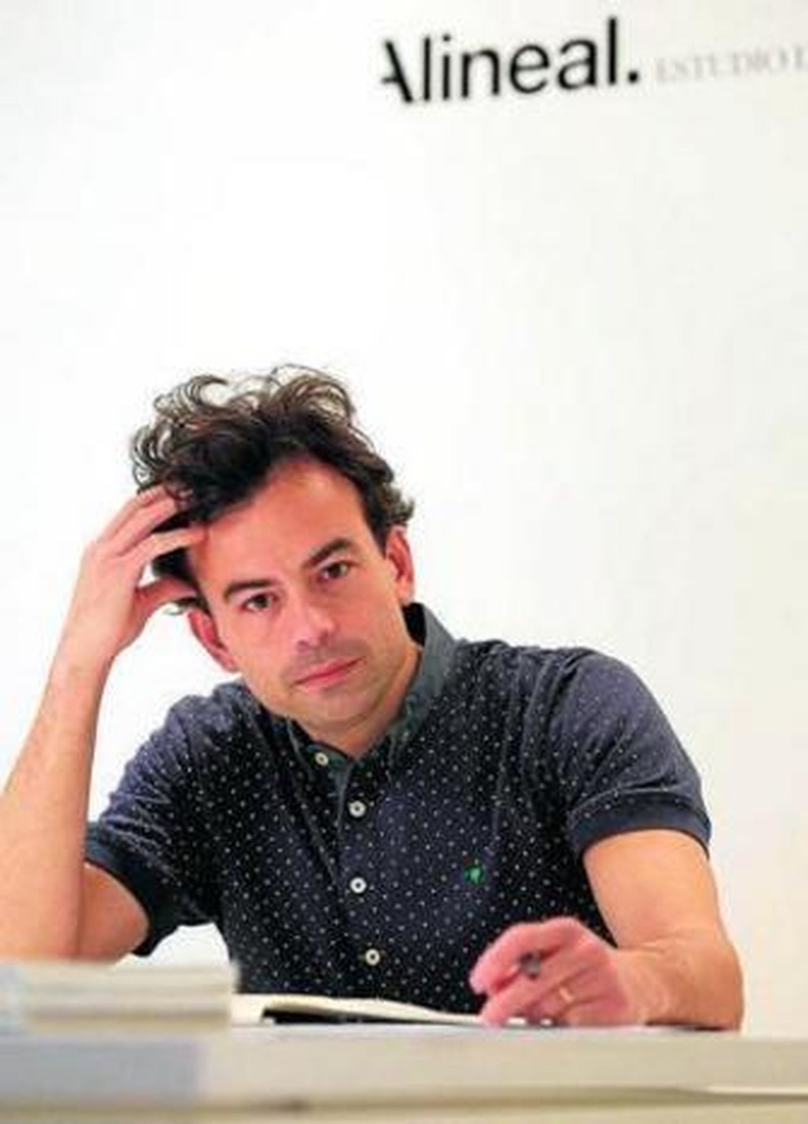 Columnas de hormigón y estanterías acabadas en hierro que se oxidan con el tiempo. La única nota de color que rompe el blanco en el interior del Estudio Alineal apela a la filosofía de su fundador, Jesús Fuentes, que apuesta por la pureza de los materiales. "Hacemos una arquitectura contemporánea con un marcado matiz de diseño", cuenta este sevillano, que trabaja desde un luminoso bajo de la calle Santa Angela de la Cruz, donde también tiene su sede la firma de diseño creada por su hermano Fernando Fuentes.