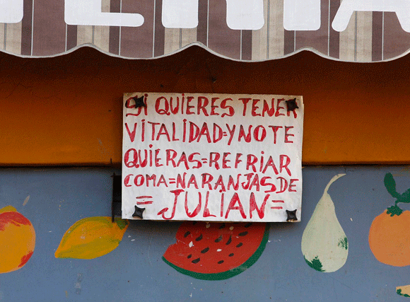 En la sevillana Plaza de San Marcos hay una frutería en cuya entrada reza este lema, que evoca el estilo publicitario de antaño, apegado al refrán, al acertijo, al romance, al dicho. Julián es, obviamente, el frutero, a quien conviene redondear la frase subsanando el gazapo ortográfico que tiene.