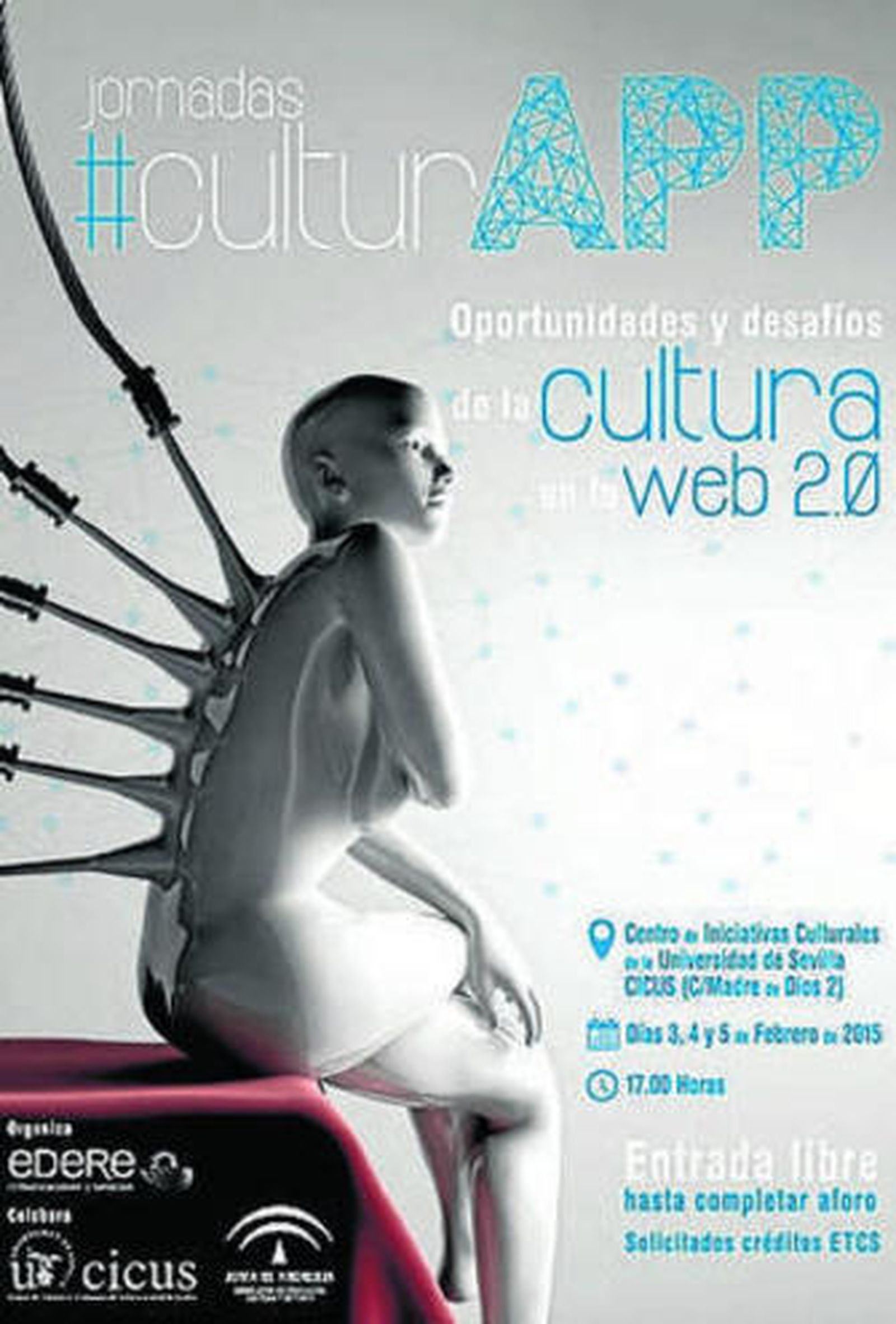 ¿Está el sector cultural capacitado para afrontar los desafíos, asumir los retos y aprovechar las oportunidades que brinda la web 2.0? A esta pregunta intentarán dan respuesta los artistas, creadores, empresarios, críticos y profesionales del flamenco, el cine y la literatura que participarán en #culturAPP, las jornadas sobre cultura y social media que organiza la agencia de comunicación Édere y patrocinan el Centro de Iniciativas Culturales de la Universidad de Sevilla (Cicus), sede de las mismas, y la Consejería de Educación, Cultura y Deporte.