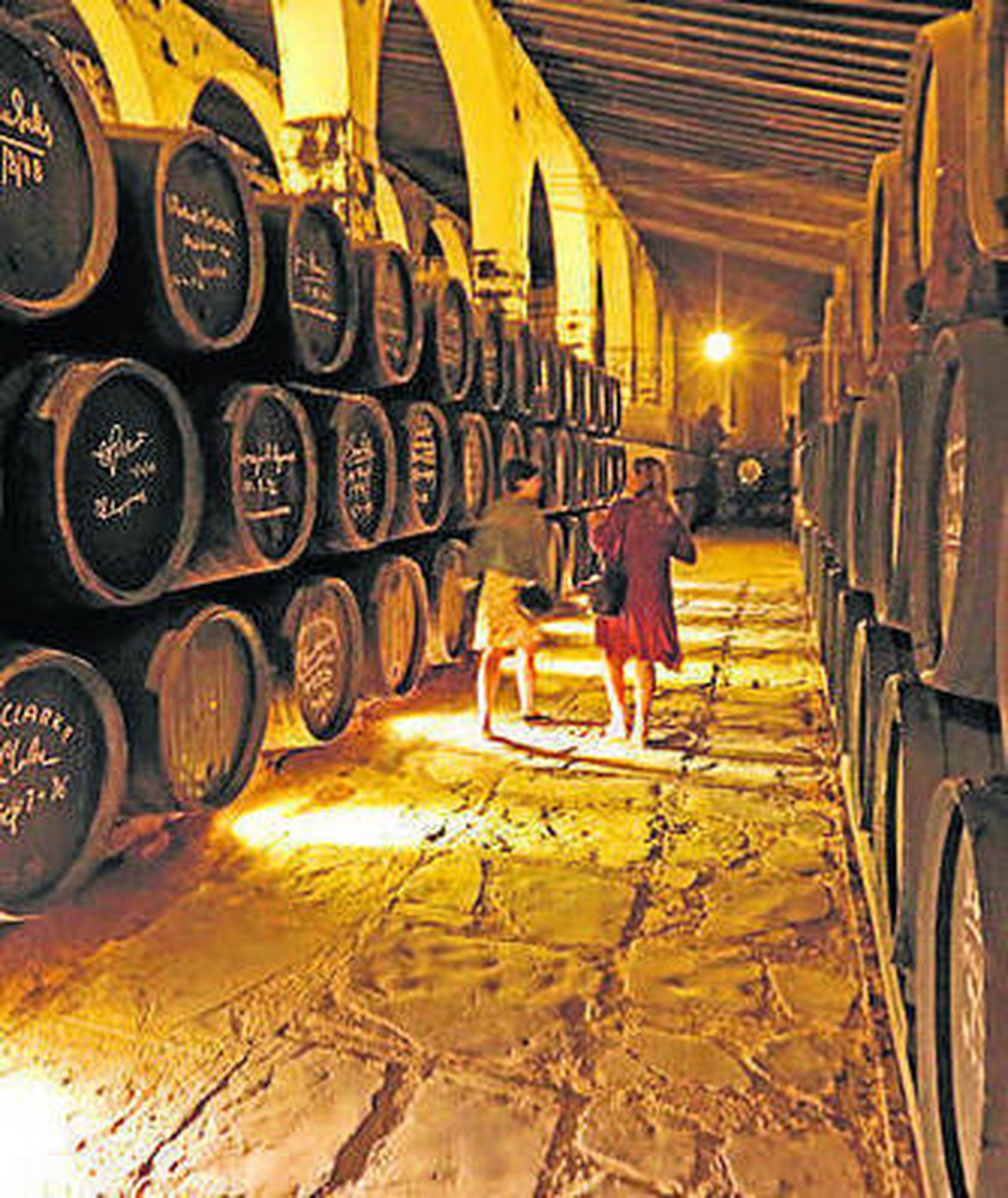 Baja la temperatura y crecen las ganas del visitante por conocer más. La amable guía Maribel conduce al grupo por el patio de los toneles adornado con herramientas de labor. Se cruzan calles cubiertas de parras que quedaron en su día dentro del núcleo bodeguero. Se alcanza La Tribuna, bodega llamada así porque, con motivo de la visita que hizo Fernando VII a Jerez en 1823, se instaló aquí una tribuna de madera para que observara, junto a su séquito, la elaboración de los vinos. Un cajón muestra también cómo es la tierra de albariza que sustenta las cepas. Se cuenta aquí, entre otras curiosidades, el funcionamiento del método de las criaderas y soleras, netamente del Marco, en cuyas botas vinos viejos y jóvenes se retroalimentan para darle sentido a todo esto. Maderas cuyas duelas se van renovando cuando se estropean. De esta forma nunca un tonel es del todo nuevo, así no hay que envinarlo para la crianza, y nunca está para el achaque. La jubilación de estas maderas es tardía. Su labor siempre es valiosa. El suspiro del ángel u olor a vino que embriaga dulcemente al visitante, forma parte de la escenografía en la que luz y oscuridad siempre tienen papel protagonista.