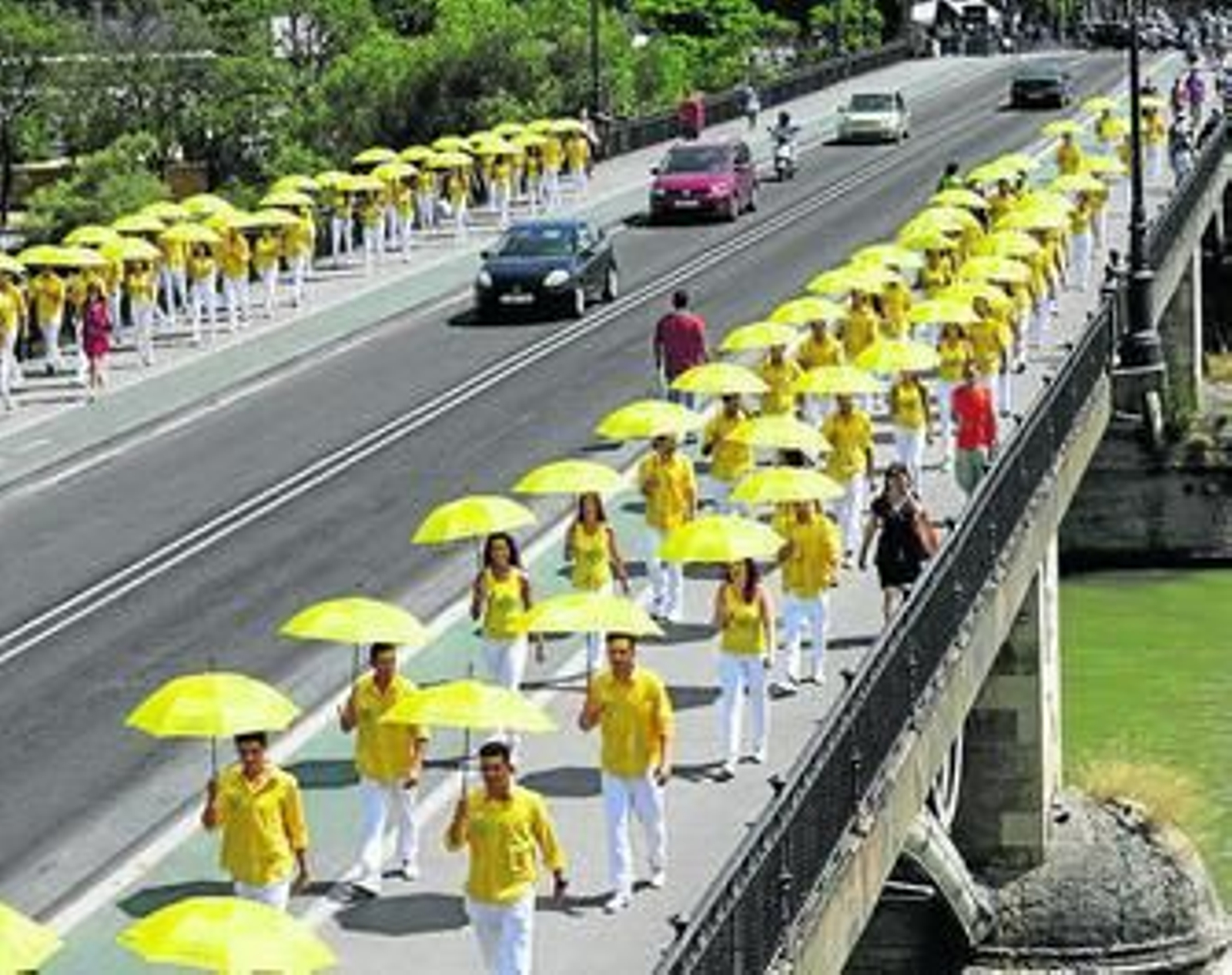 Triana, 12 del mediodía y ni un solo rincón donde dé algo de sombra. Cruzar a la otra orilla resulta casi misión imposible. Las mujeres sacan sus abanicos para sofocar los calores y los hombres utilizan las manos para tapar como pueden los rayos del sol. De pronto, una masa amarilla cargada de paraguas empieza a desfilar por el Puente de Triana. Caras de sorpresa, otras de alivio y algunas de incertidumbre. Los vecinos del barrio comenzaban a preguntarse qué hacía tanta gente portando un paraguas con 40 grados de temperatura. La respuesta no se hizo esperar. El comando de chicos de amarillo formaban parte de la campaña que Cruzcampo Radler está llevando a cabo en España, Expertos contra el calor.