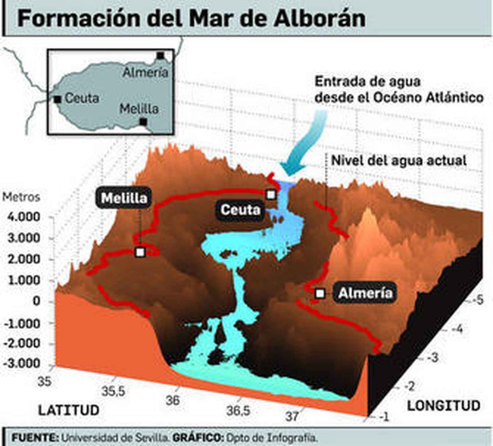 Mediante una simulación numérica de fluidos José María Abril y Raúl Periáñez -dos de los científicos que han participado en el estudio- han demostrado cómo fue la formación. Después de las primeras observaciones, se dieron cuenta de que lo que comenzó siendo una modesta corriente de agua aumentó muy rápidamente debido a la erosión y a un efecto de retroalimentación. "Por lo que hoy es el Mar de Alborán discurría una enorme corriente de agua procedente del Atlántico a una velocidad de 100 kilómetros por hora", explica José María Abril.