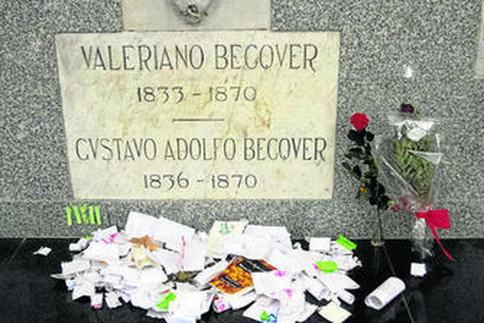 Gustavo Adolfo Claudio Domínguez Bastida nació en Sevilla el 17 de febrero de 1836. El apellido Bécquer lo adoptó de sus ancestros paternos de origen flamenco para procurarse un nombre con más sonoridad y prestigio en su prometedora carrera literaria. Es éste uno de los detalles que se descubren durante las visitas guiadas y gratuitas que organiza la Universidad de Sevilla al Panteón de Sevillanos Ilustres, donde se encuentran los restos mortales del poeta y de su hermano Valeriano, quien pintó el conocido retrato que de Gustavo Adolfo se conserva en el Museo de Bellas Artes de Sevilla. La citada cripta se reconstruyó sobre la que hubo de jesuitas gracias a la iniciativa promovida por el entonces director general de Bellas Artes, Florentino Pérez Embid, en la década de los setenta. Un espacio al que se accede desde la Facultad de Bellas Artes de la Universidad de Sevilla, sita junto a la Iglesia de la Anunciación, y cuyas visitas se pueden concertar a través de extension9@us.es y el 954 551 052. Allí, Bécquer comparte panteón con otras figuras cuya relación con la capital andaluza fue estrecha como los Ponce de León, relacionados con la Casa de Trastámara de la que procedía Isabel la Católica; la escritora Cecilia Böhl de Faber; el militar navarro Francisco Duarte de Mendicoa y su esposa, Catalina de Alcocer, fundadores del convento de los mínimos de la Victoria, en Triana; Lorenzo Suárez de Figueroa, fundador del convento sevillano de Santiago de la Espada; Luis José Sartorius y Tapia, periodista que con el apoyo de Bravo Murillo fundó El Heraldo; los ilustrados Alberto Lista y Aragón y Félix Reinoso y Gómez; Rodrigo Caro, y José Amador de los Ríos, entre otros. La lápida de Gustavo Adolfo Bécquer es la única que acumula cartas y dedicatorias, sea cual fuere el día del año que marque el calendario. Aunque seguramente hoy, el censo de misivas aumente, como también es posible que en la Venta de los Gatos, el ventorrillo donde nació una de sus rimas y que frecuentaba el poeta, y en su casa natal en la calle Conde de Barajas también dejen huella quienes, como él, son unos románticos empedernidos.
