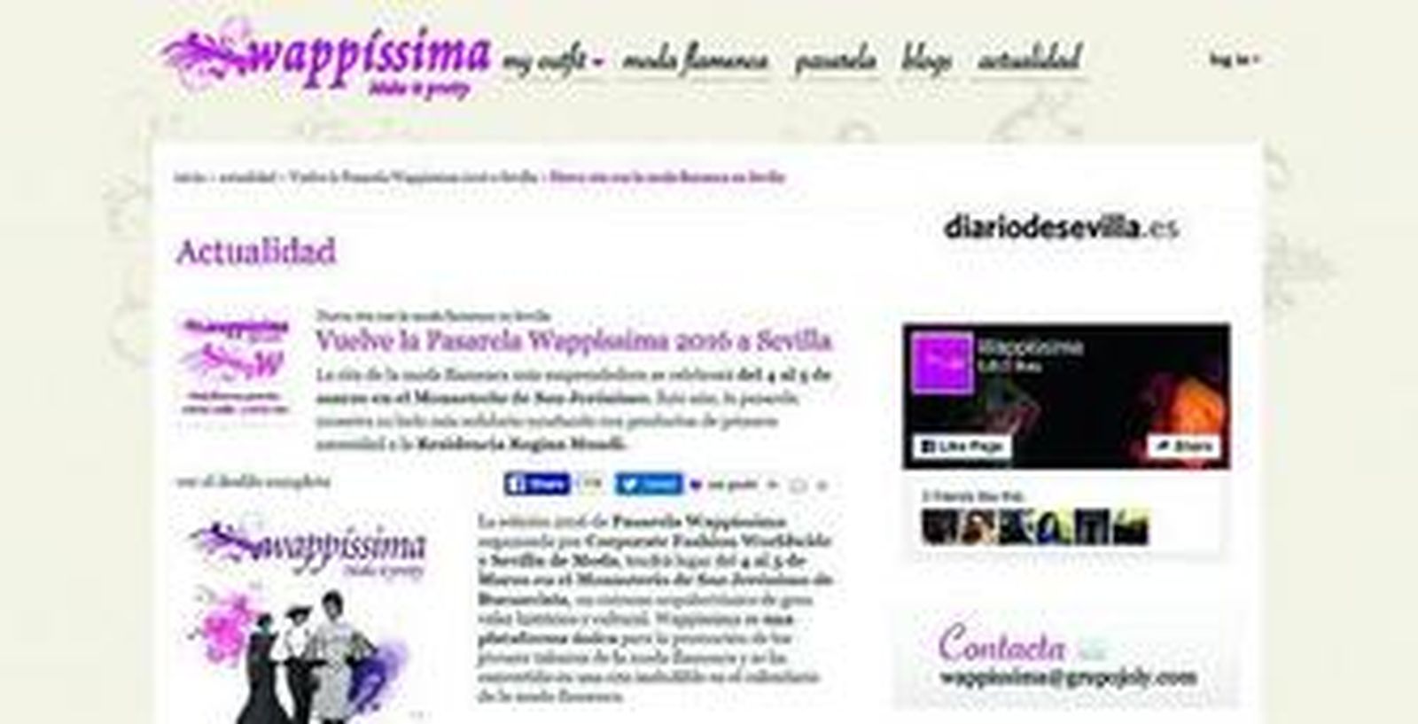 Wappíssima, la plataforma on line del Grupo Joly, es el principal patrocinador y da nombre a la Pasarela de Moda Flamenca de Sevilla de Moda, donde los asistentes podrán disfrutar de un centenar de propuestas de emprendedores que se abren camino con fuerza en el sector. La edición 2016 mostrará pases colectivos de creativos noveles y unas 20 firmas consagradas como antesala de la Feria de Abril.