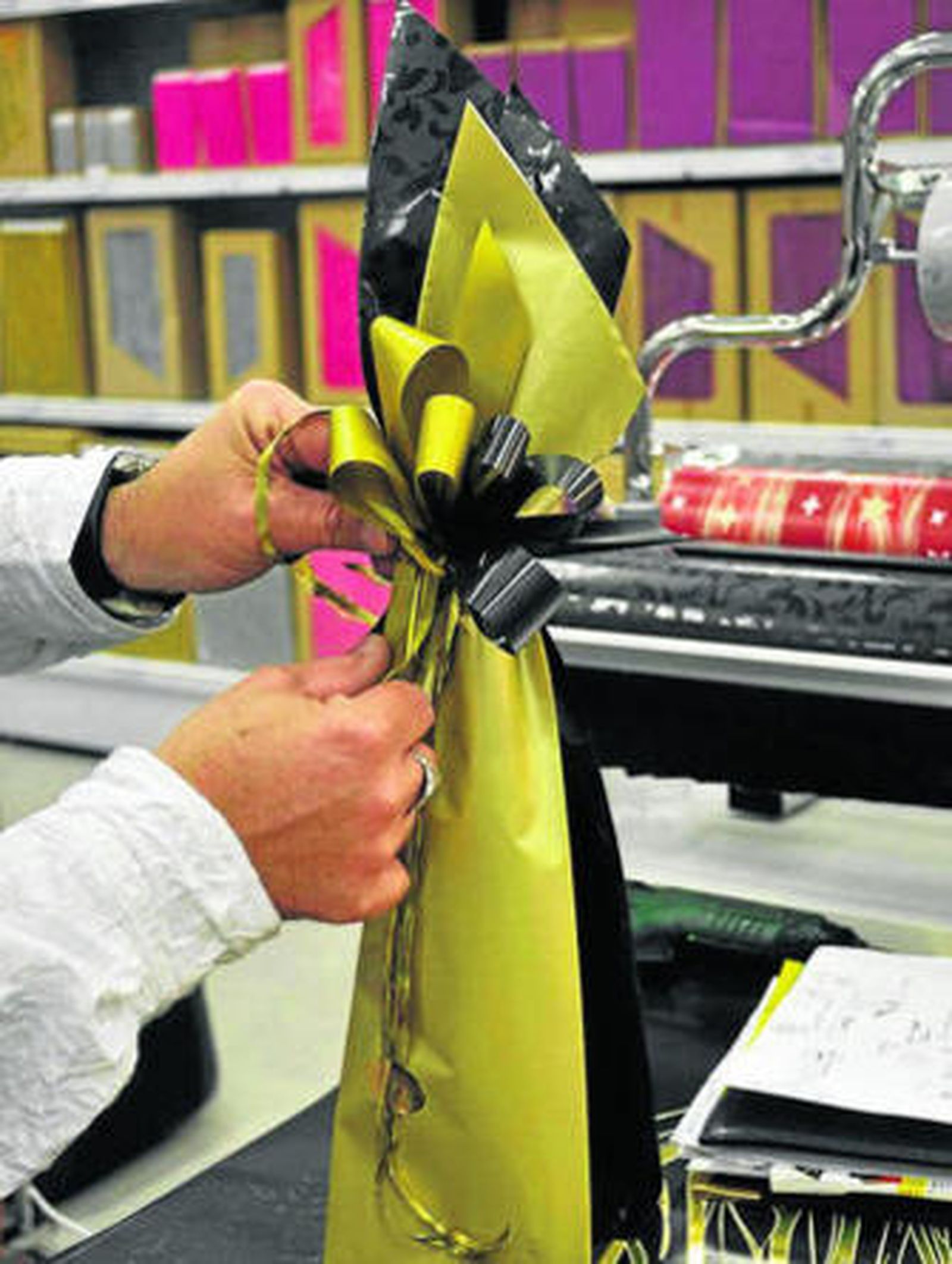 No todos los que se acercaron al expositor donde Emilio González hacía sus demostraciones prácticas eran comerciantes. Mª Carmen Ares Sánchez es vecina de Bormujos, se enteró del taller y acudió hasta la tienda. "Se me da bastante bien lo de envolver regalos; de hecho, mis amigas me traen sus regalos para que se los envuelva". Su talón de Aquiles, confiesa, "las botellas", un artículo con el que González derrochó imaginación y maestría a la hora del empaquetado. "Dan ganas de dejarla sin abrir, expuesta en el mueble de casa", añadió una de las asistentes.