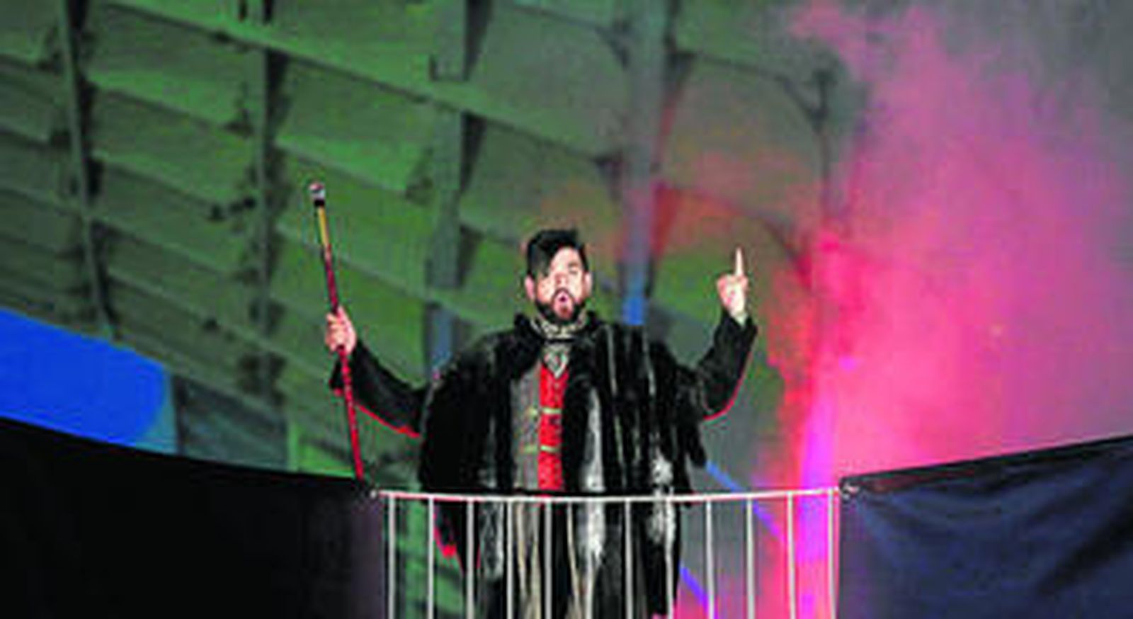 Humo colorado y los acordes de The show must go on, de Queen, ambientaban la puerta sur del Mercado de la Encarnación, mientras el público se impacientaba por verle. "Nos han dicho que aquí está Manu Sánchez y nos encanta", se excusaba una joven al paso de un ciclista. Poco después de las seis y media de la tarde, con medio centenar de personas esperando su aparición, el humorista empezó a interpretar su particular versión del tema de la famosa banda. Con esta nueva letra de la popular canción, presentó a su personaje, "al que llaman el ángel caído porque a todo el mundo le cae bien". Con indumentaria negra y roja y un flequillo desfilado, el showman dijo haber dudado entre hacer esta aparición en la Torre Pelli o en las setas, "los dos claros ejemplos de que en Sevilla está próximo el apocalipsis". Porque de eso trata su nuevo espectáculo: de la catástrofe a la que se encamina la sociedad actual.