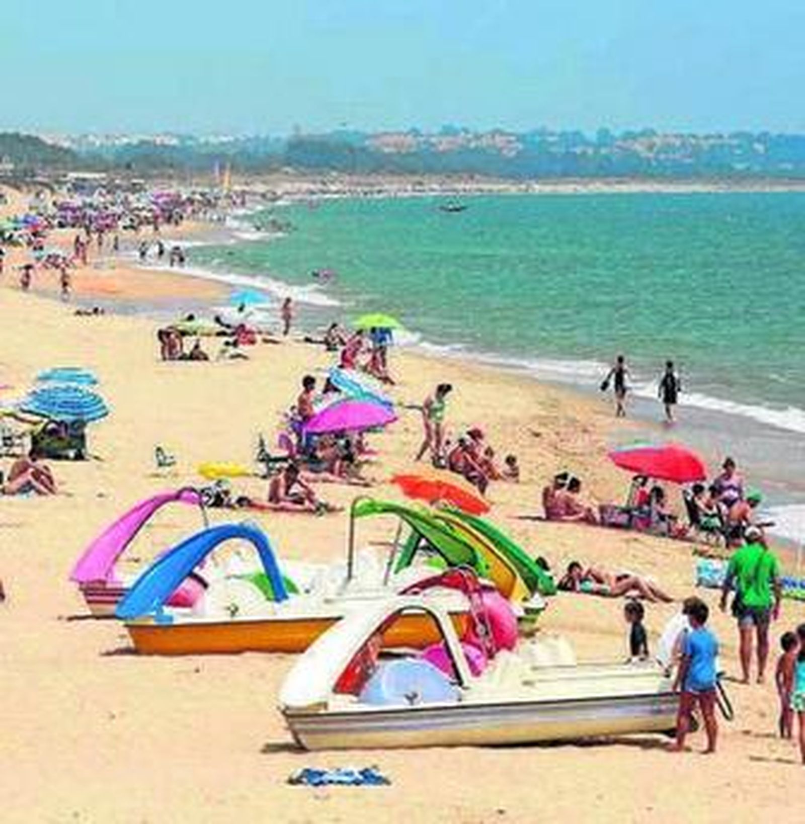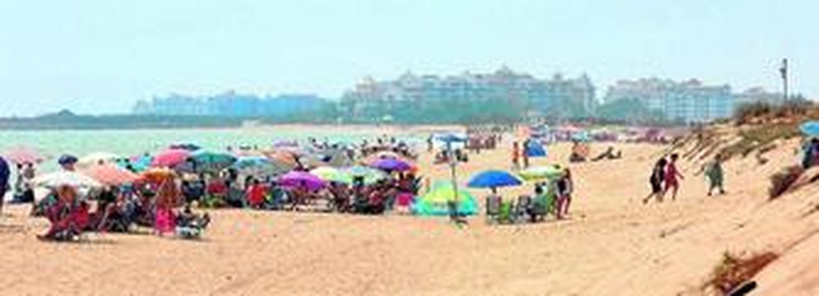 La playa de la Gaviota, abierta al Atlántico, con la barra de Isla Cristina y Punta del Moral al fondo.