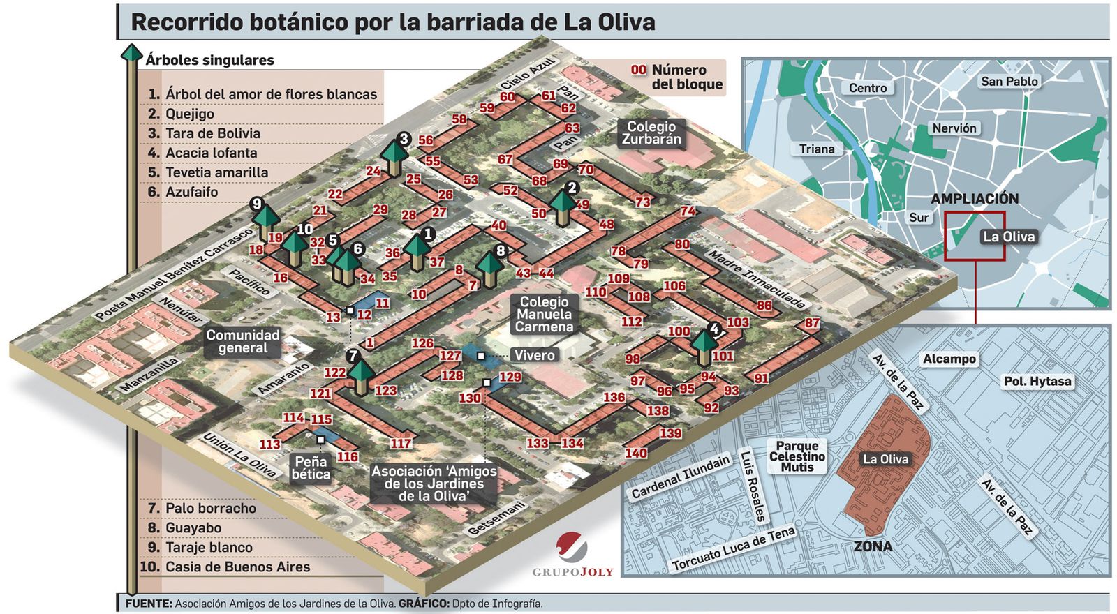 93 especies de árboles, 48 especies de arbustos y cuatro especies de palmeras. Éste es el contenido botánico de la barriada Nuestra Señora de la Oliva. Un inventario realizado por la Asociación Amigos de los Jardines de la Oliva, entidad modelo por sus reivindicaciones medioambientales tanto en el barrio como en las distintas zonas verdes de la ciudad. De todas las especies, destacan en la Oliva aquellas consideradas singulares, bien por la amenaza latente de desaparecer que pesa sobre ellas bien por tratarse de arbustos o árboles de procedencia extranjera, en algunos casos ejemplares únicos. Es en estos arbóreos más peculiares en los que se centra el recién creado recorrido botánico por la barriada, que invita a aproximarse a estas especies y su origen.