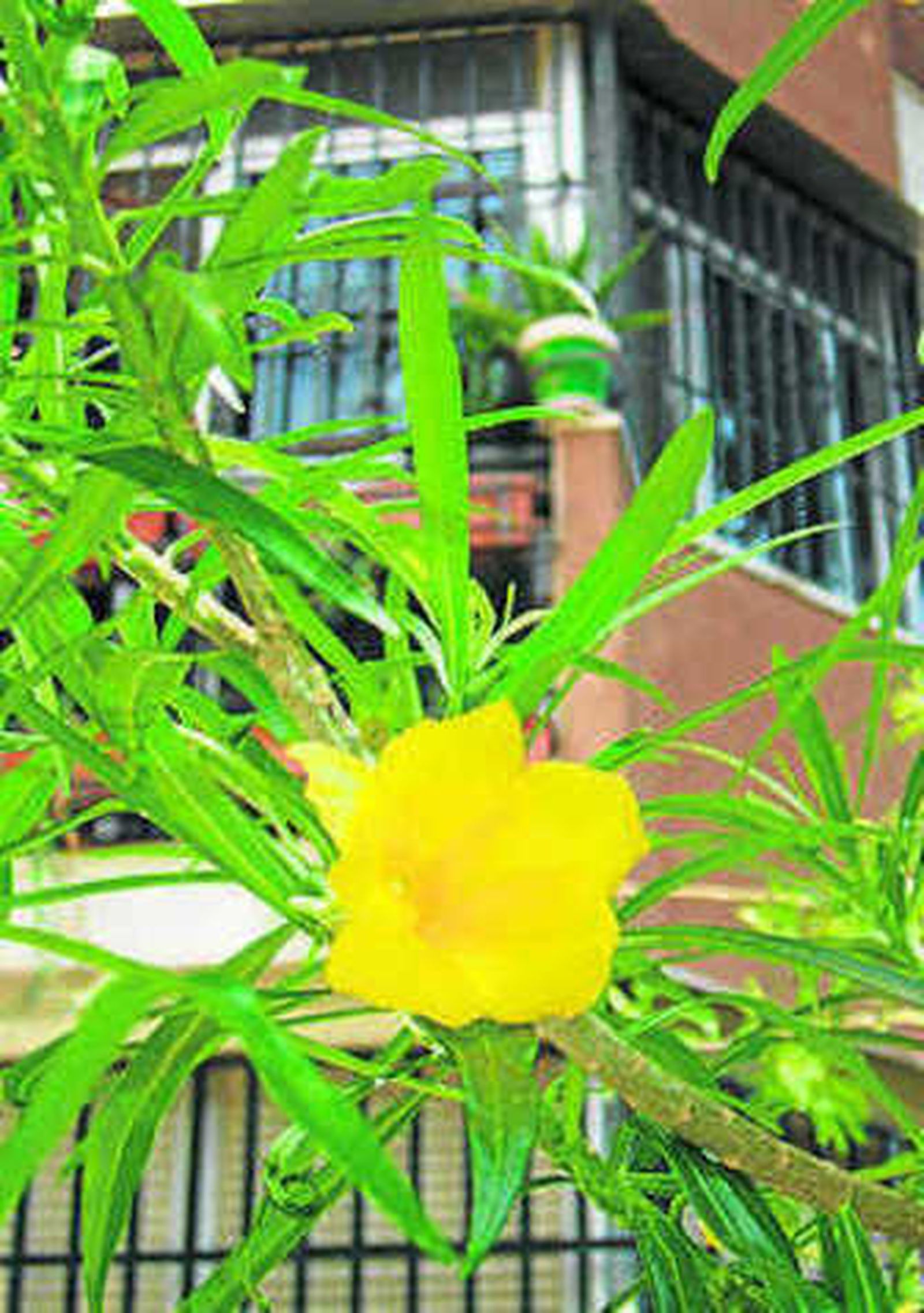 La tevetia amarilla -thevetia peruviana (Pers.) K. Shum- fue plantada el 19 de junio de 1993, Día del Barrio, en el jardín lateral del bloque 34. En los jardines de los Reales Alcázares se encuentran los ejemplares más antiguos, pero también los hay en el Jardín Americano, fruto de la contribución que realizó Colombia para el Programa Raíces enviando unos plantones de esta especie que llegaron al vivero de la Expo 92 el día 15 de marzo de 1987.